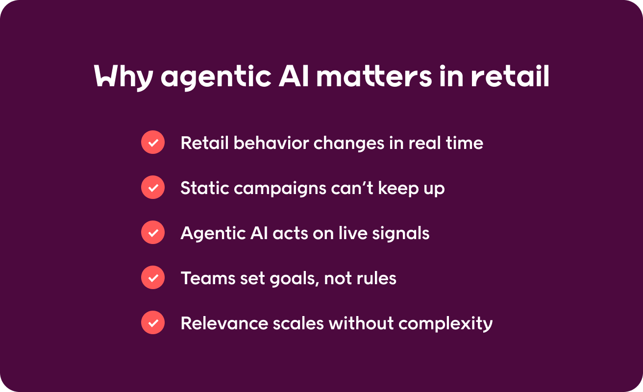That is why agentic AI aligns so closely with retail marketing today, and why it is becoming a competitive advantage as market shifts continue.
