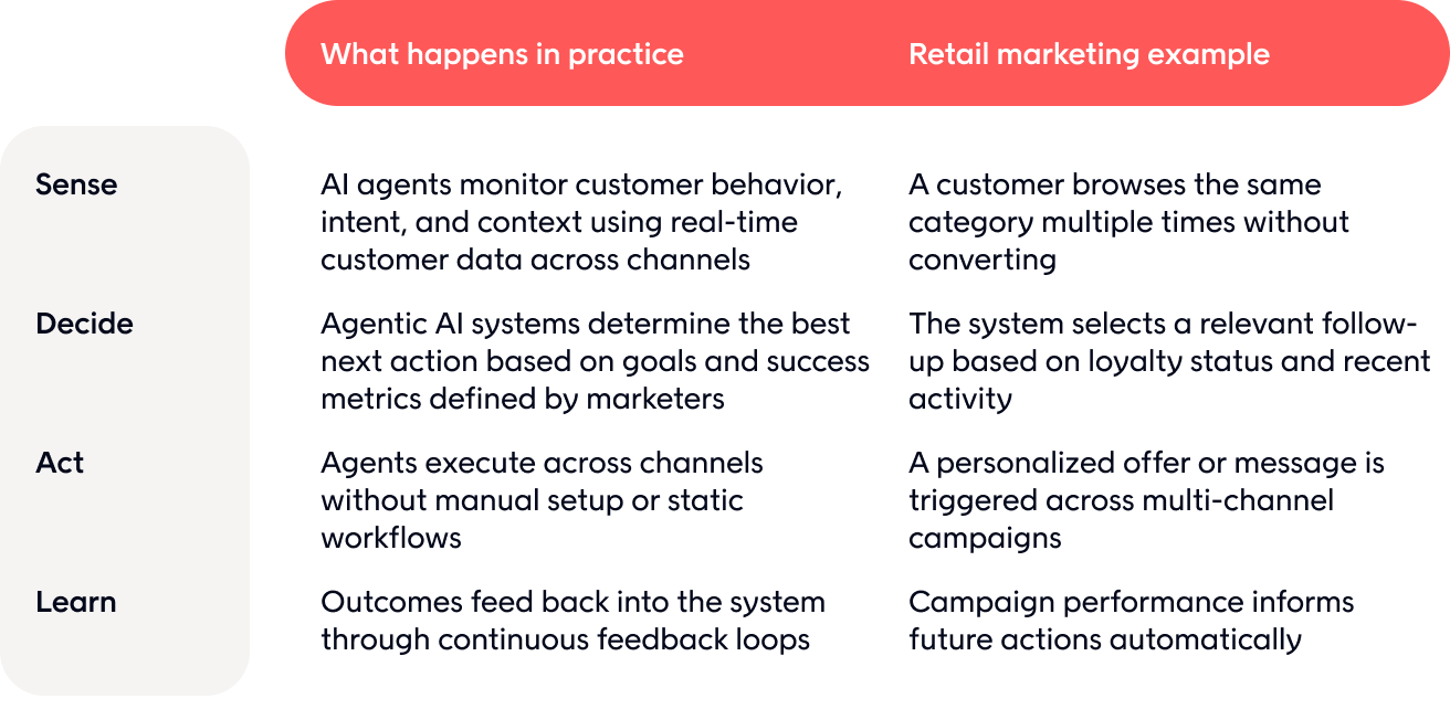 Instead of producing insights for teams to act on later, agentic AI for marketing takes action as customer behavior changes. That action can happen across the customer journey, without waiting for manual steps or predefined workflows.