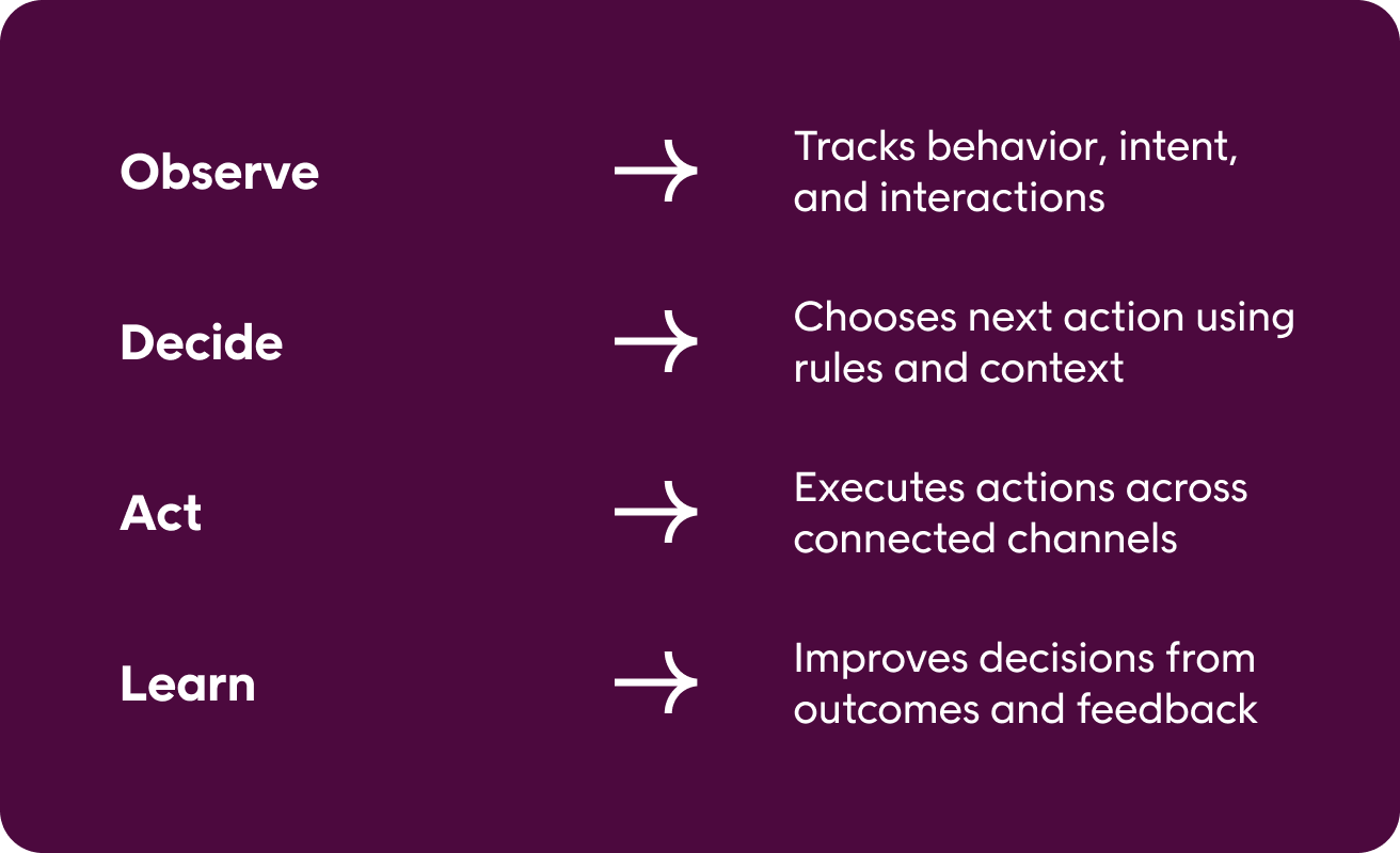 Agentic AI in retail CX follows a clear operating loop. It continuously observes customer signals, decides what should happen next, takes action across systems, and learns from the outcome.
