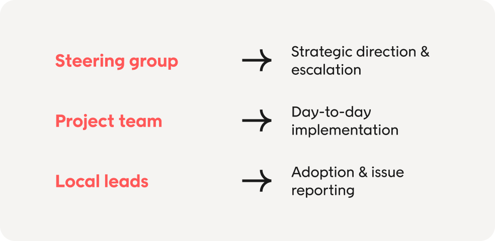 You’re aligning people, processes, and tools so transformation doesn’t stall after launch.
