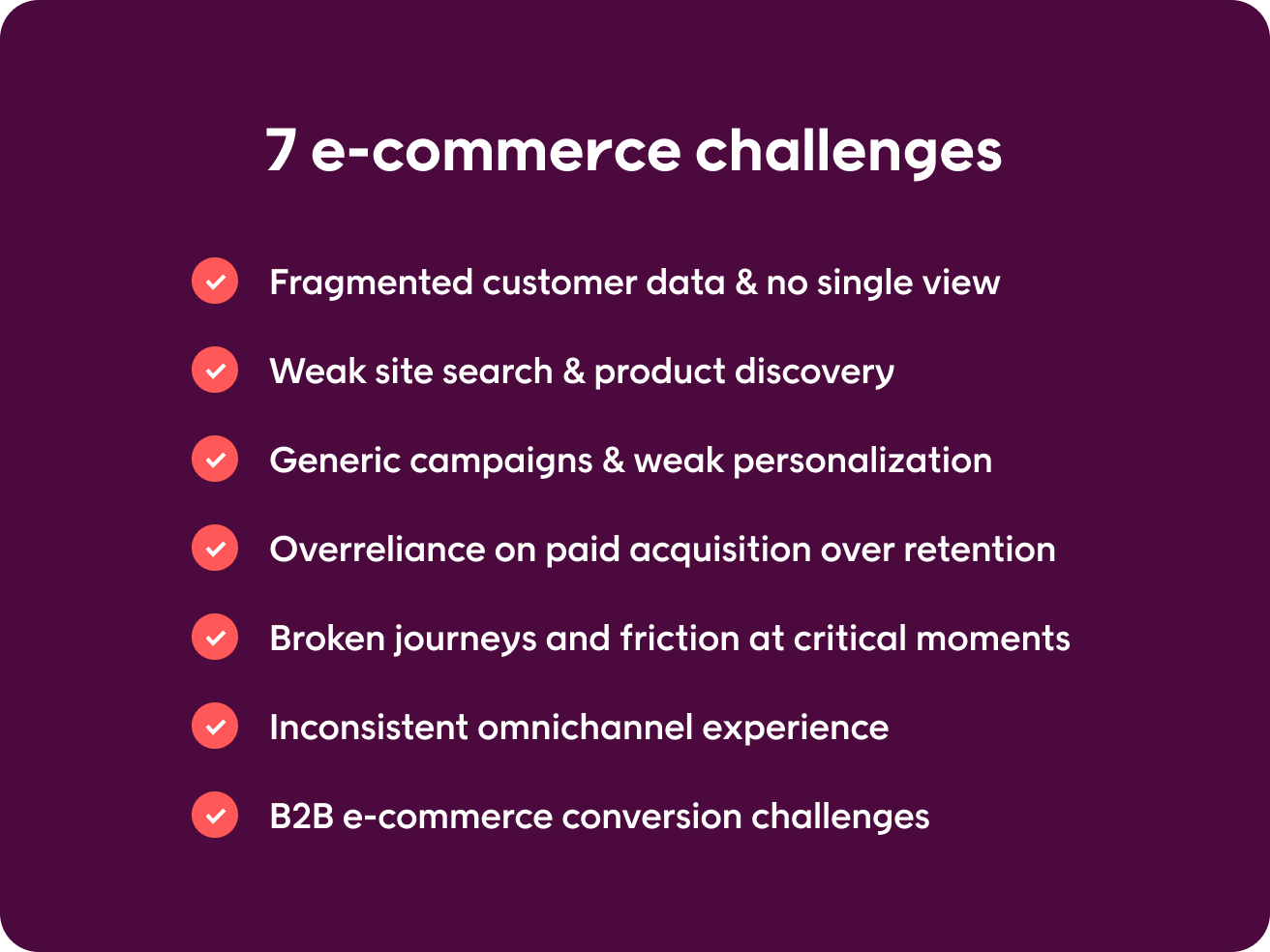 E-commerce challenges impact conversion by creating friction at key moments. Generic campaigns, poor site search, and disconnected journeys reduce relevance and weaken customer trust. When customer data is not unified, optimization becomes guesswork instead of strategy.